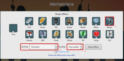Simply follow these steps: Market » Product Market » Select Weap.(1) » Choose the Country(2) from wich you whould like to buy them » Choose the quality(3) » Click on View offers » Buy the required amount